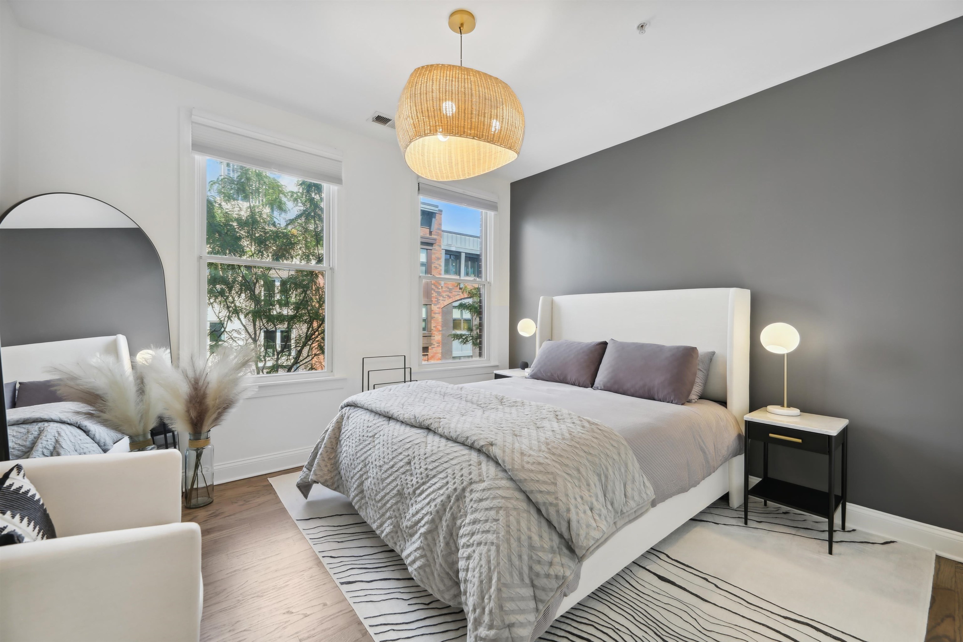 Gorgeous 2 bedroom Paulus Hook stunner with an on-site garage parking space INCLUDED! This property is available unfurnished or beautifully furnished as shown for an additional fee. Upgraded to the highest of standards throughout, this super bright home shows right out of a top design magazine! High ceilings, central HVAC, Nest thermostat, chef's kitchen with quartz carrara countertops, top of the line s/s appliances, breakfast bar, gleaming cocoa hardwood floors, sleek paint/trim with chic black hardware and charcoal accent walls, spa-like bath with imported tile, double vanity, frameless glass shower with soaking tub, great closet space! Located in the heart of super desirable Paulus Hook, your in the heart of everything....dining, shopping, PS16/Bradford schools, NY Waterway, Exchange Pl. Path station, Whole Foods market, waterfront boardwalk promenade, etc. 126 Dudley is an elevator building with virtual doorman, on-site garage (with guest parking), and full gym. This home is DREAMY!