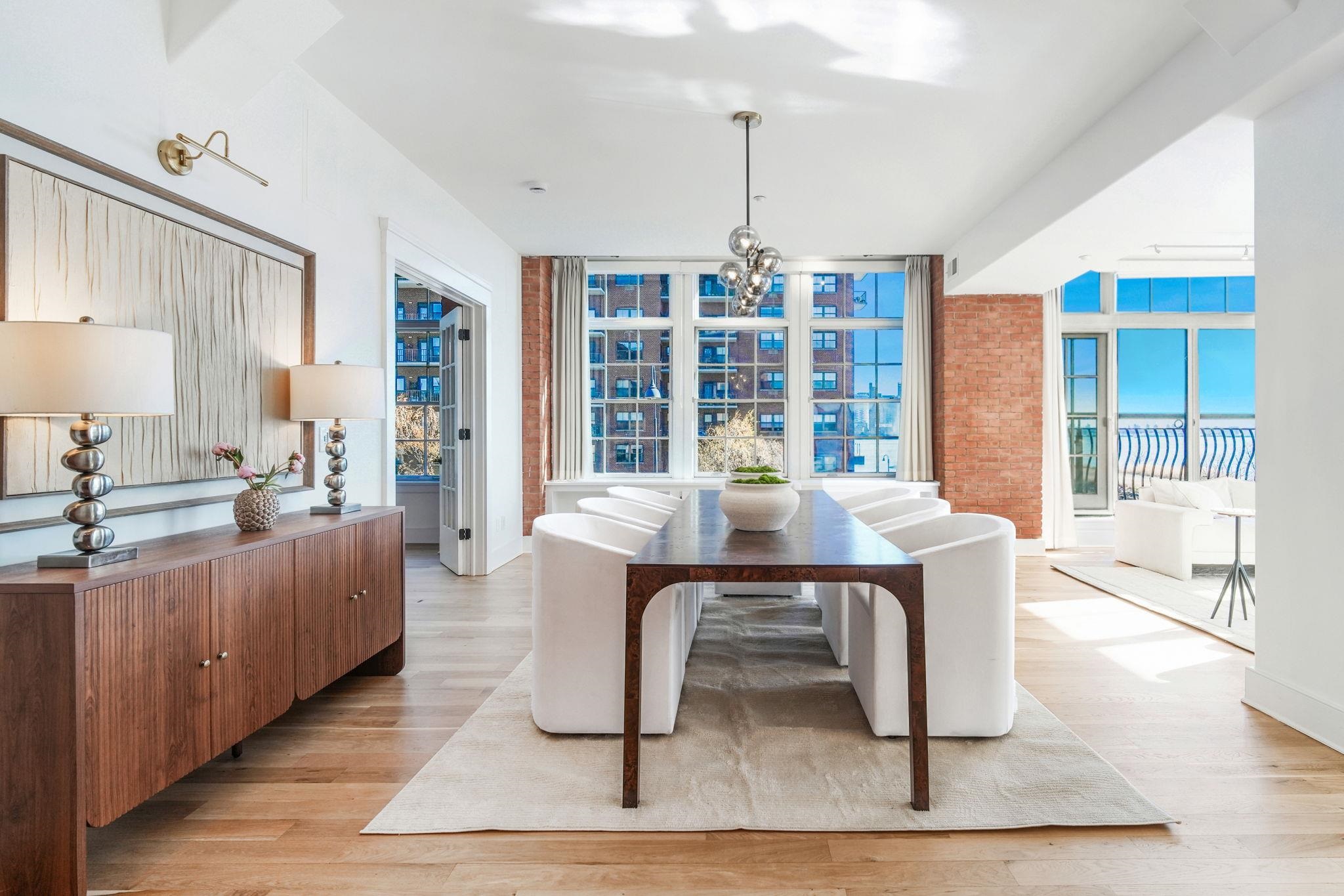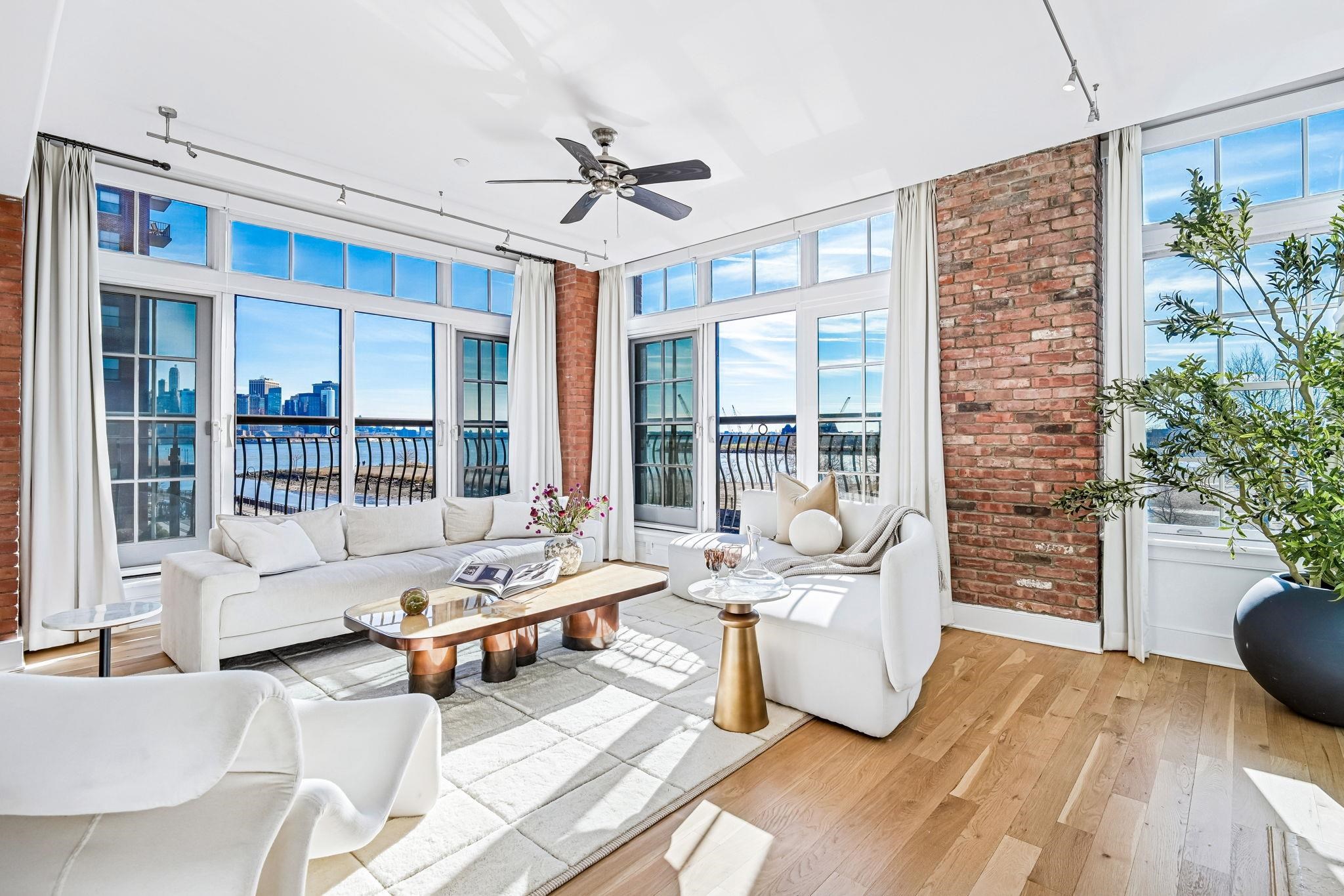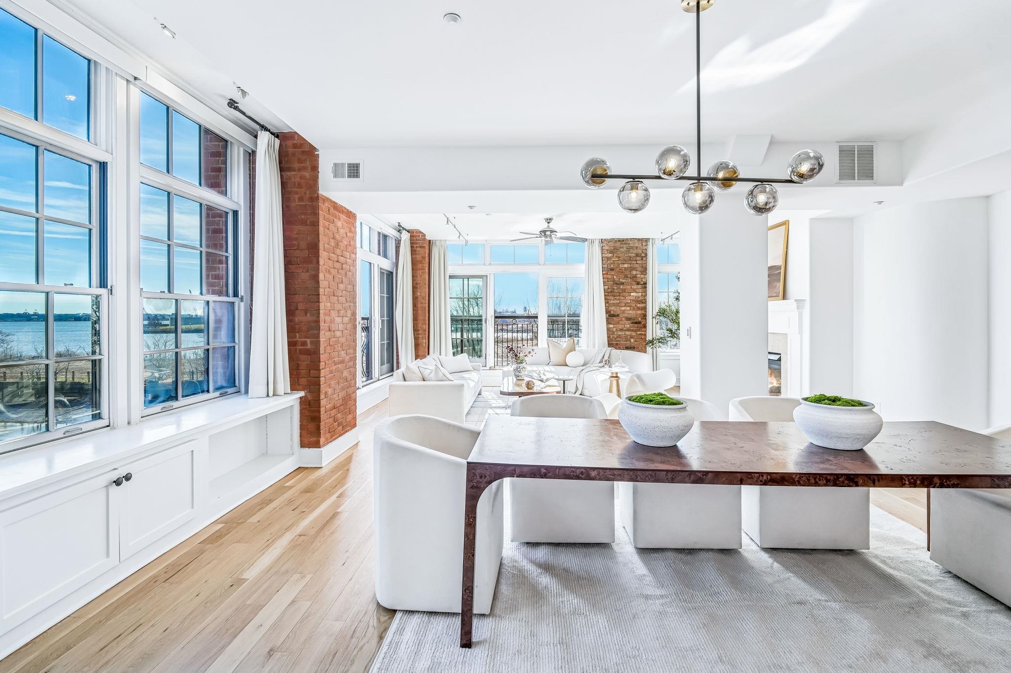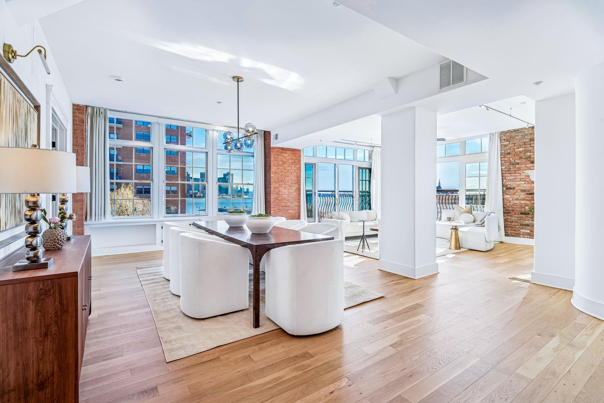 Spectacular living with over 2000 sq ft of opulence positioned directly on the Hudson River! This beyond rare "L" line in the coveted Sugar House is just 1 of 4 homes in the entire building with direct, protected, and unobstructed panoramic South AND East views. Encased in glass, this massive corner trophy home is finished to the highest level of luxury and refinement. Brilliant matte hardwood floors are offset by historic, exposed, barrel vaulted brick ceilings and detail. Taking full advantage of the prominent location, streaming sunlight fills the entire home throughout the day. The world is your moving artwork as the magnificence of the Hudson River and surrounding landmarks unfold in front of you. Your sprawling living/dining grand salon features 2 sets of french sliders opening onto dual Juliette balconies. Host any number of friends and family in this magnificent space, complete with roaring gas fireplace, custom built-ins, and architectural lighting. Chef's rejoice, as your culinary haven awaits, with a full suite of Viking appliances, new calacatta statuario quartz countertops, and abundant Ultracraft wood cabinetry. The primary suite is nothing short of a luxury retreat......king-sized proportions, separate sitting/home office/nursery area, California style walk-in closet, and tumbled marble spa bath with two person shower and separate jetted tub. The second bedroom is equally large, with oversized transom windows and those showstopper vaulted brick ceilings! The second full bathroom is smartly placed for privacy and features custom wainscoting and stone tile. One private, on-site, garage parking space is included with the sale. The Paulus Hook icon, Sugar House, features 24-hour concierge/security, fully equipped gym with Pelotons, steam room, dry sauna, trainer changing rooms, lovely manicured resident outdoor terrace with mature plantings, professional grade bbq grills, lounge, dining, and play areas. Enjoy this magnificent neighborhood with the best dining, nightlife, shopping, parks, Hudson River promenade, and coveted PS16/Bradford school district. Minutes to NYC via 2 Path stations, NY Waterway, or auto. A remarkable and fabulous opportunity!
