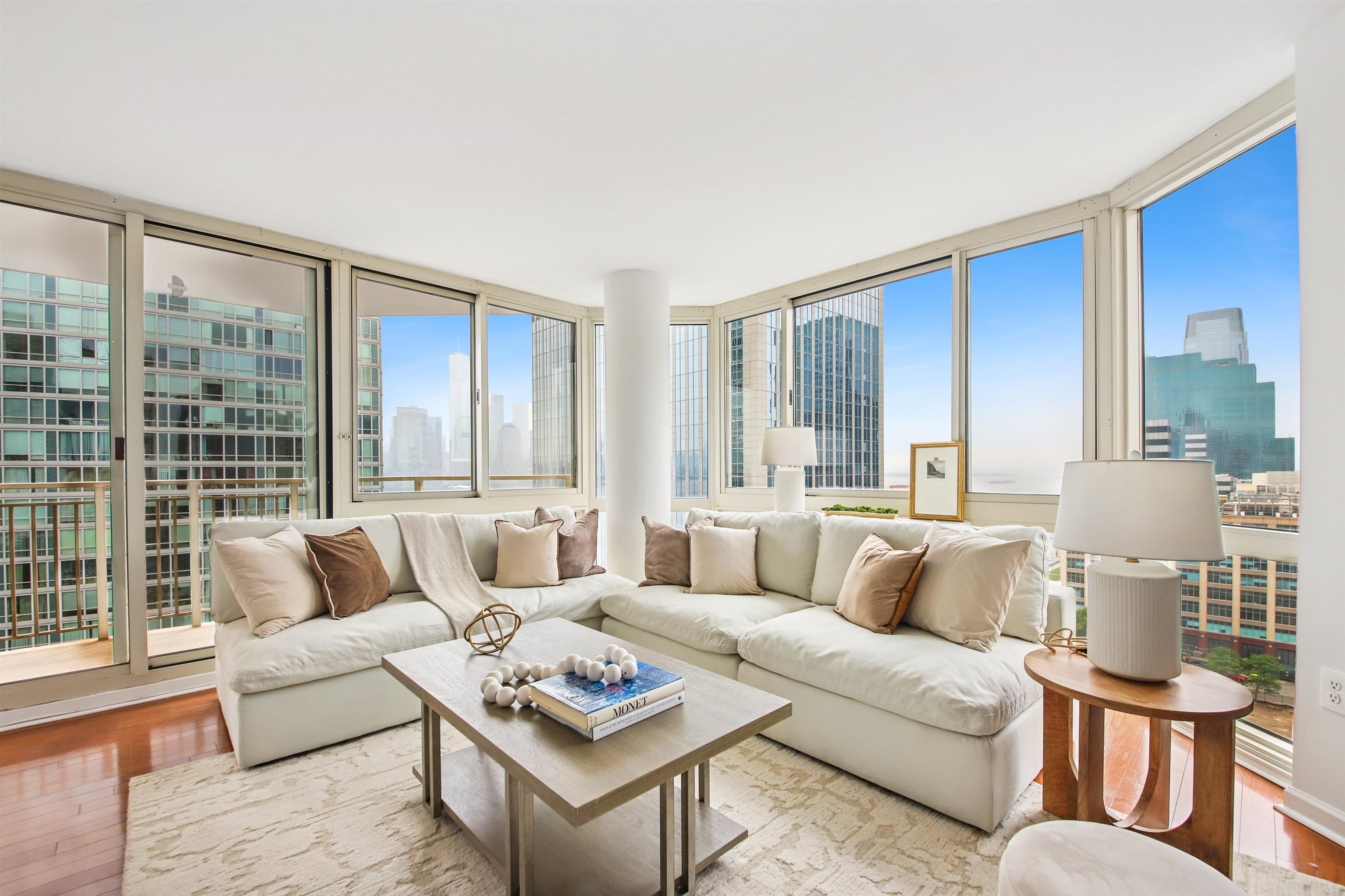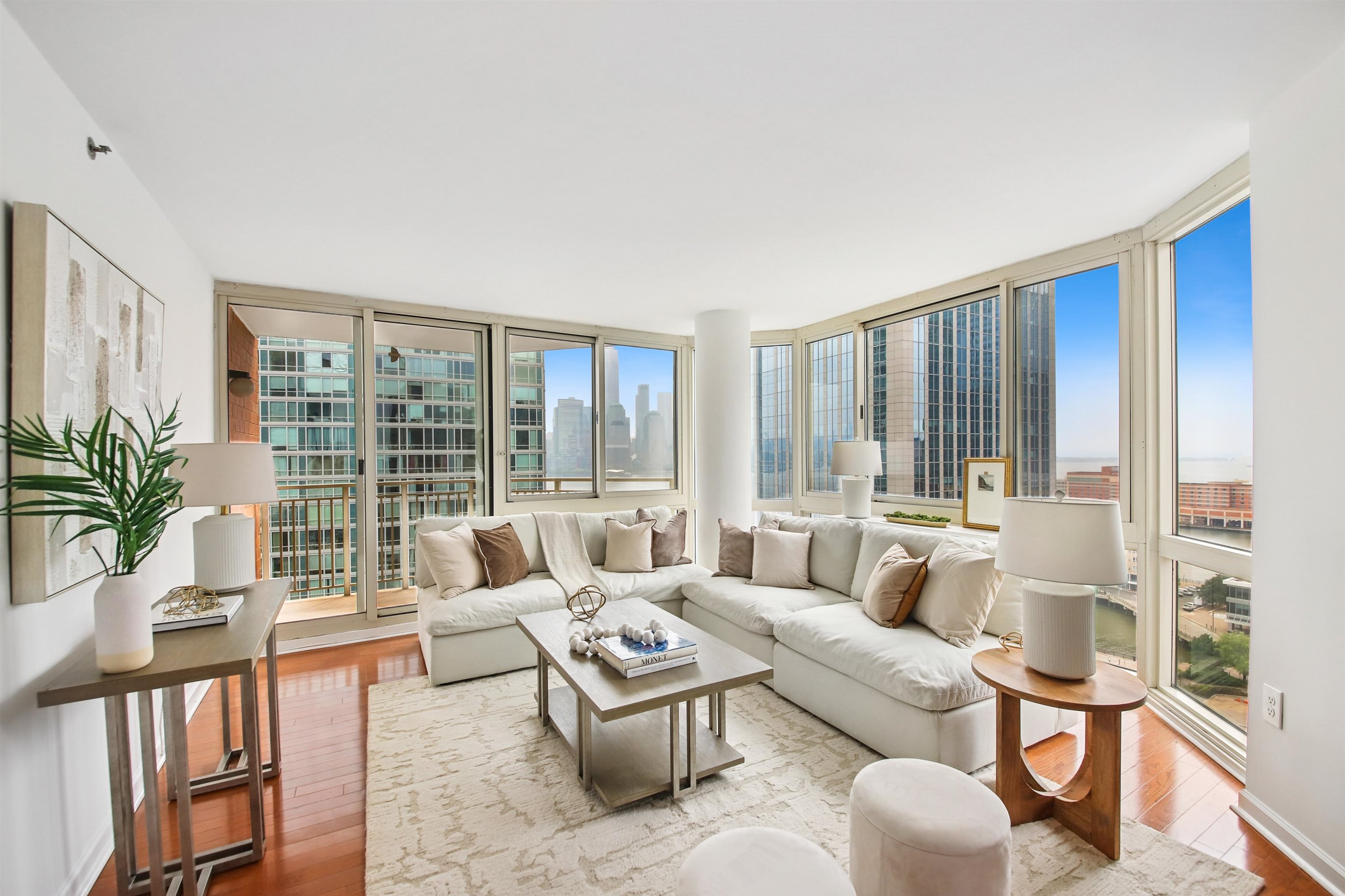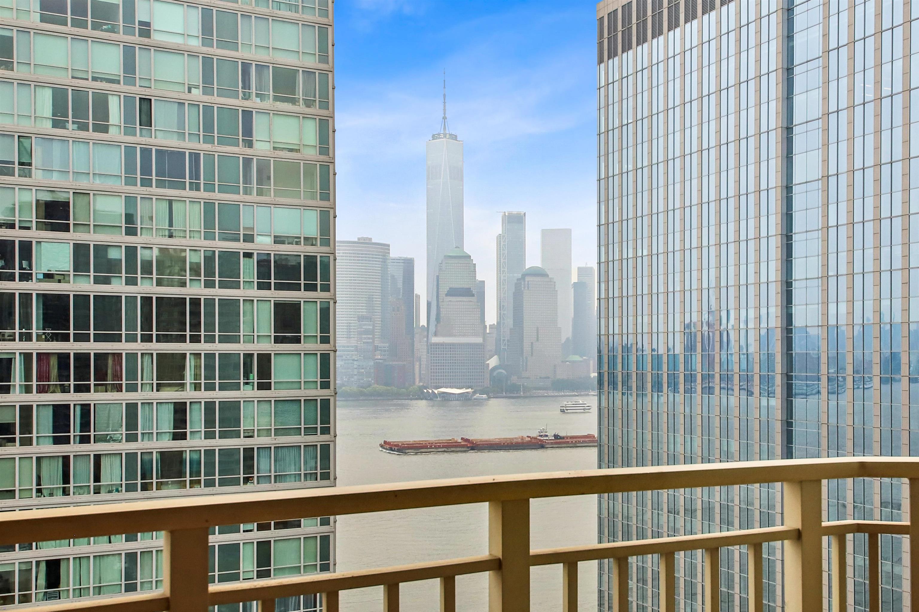 19TH FLOOR SOUTHEAST CORNER, with Unbelievable Views, Privacy, and Quiet! This spectacular, high floor, 3 BEDROOM, 2 bath, wrap corner residence on the EXCHANGE PLACE waterfront! Perched on the 19th floor with unbelievable, panoramic vistas, this trophy property is truly exceptional. Over 1,450 square feet of opulence featuring triple exposures (S/N/E), outlining some of the world's most beautiful landmarks. Wrapped entirely in glass, this light-filled home features gleaming hardwood floors, brilliant paint hues in Benjamin Moore whites, and decorator lighting. A private entry foyer opens onto the large living/dining area and an oversized balcony framing the Freedom Tower front and center! Indoor/outdoor living is all yours as these incredible views serve as your backdrop for al fresco dining, lounging, and entertaining. The chef's kitchen features a full suite of s/s appliances, high end countertops, and reflective tile backsplash finished in "steel". Wake up each morning looking directly at the Empire State Building in your primary ensuite bedroom, which is a king-sized sanctuary! Featuring a large, California-style walk-in closet, stone bath, and soaking tub. Two other generous bedrooms also frame spectacular views, and another full bath stone bath, is smartly placed on the other side of the home for both privacy and personal space. A full size in-home LG wash tower W/D, storage galore, and an INCLUDED garage parking space complete this waterfront dream. The full service Mandalay resides directly on the Exchange Place waterfront, and features 24 hr. concierge/security, package service, sparkling heated waterfront pool and outdoor terrace, gym, and on-site management office. Terrific shopping, dining, nightlife, waterfront promenade, 2 PATH stations, the NY Waterway, and multiple education options are right outside your front door! A spectacular lobby renovation is underway and slated to be completed shortly. A true family-sized property not to be missed!