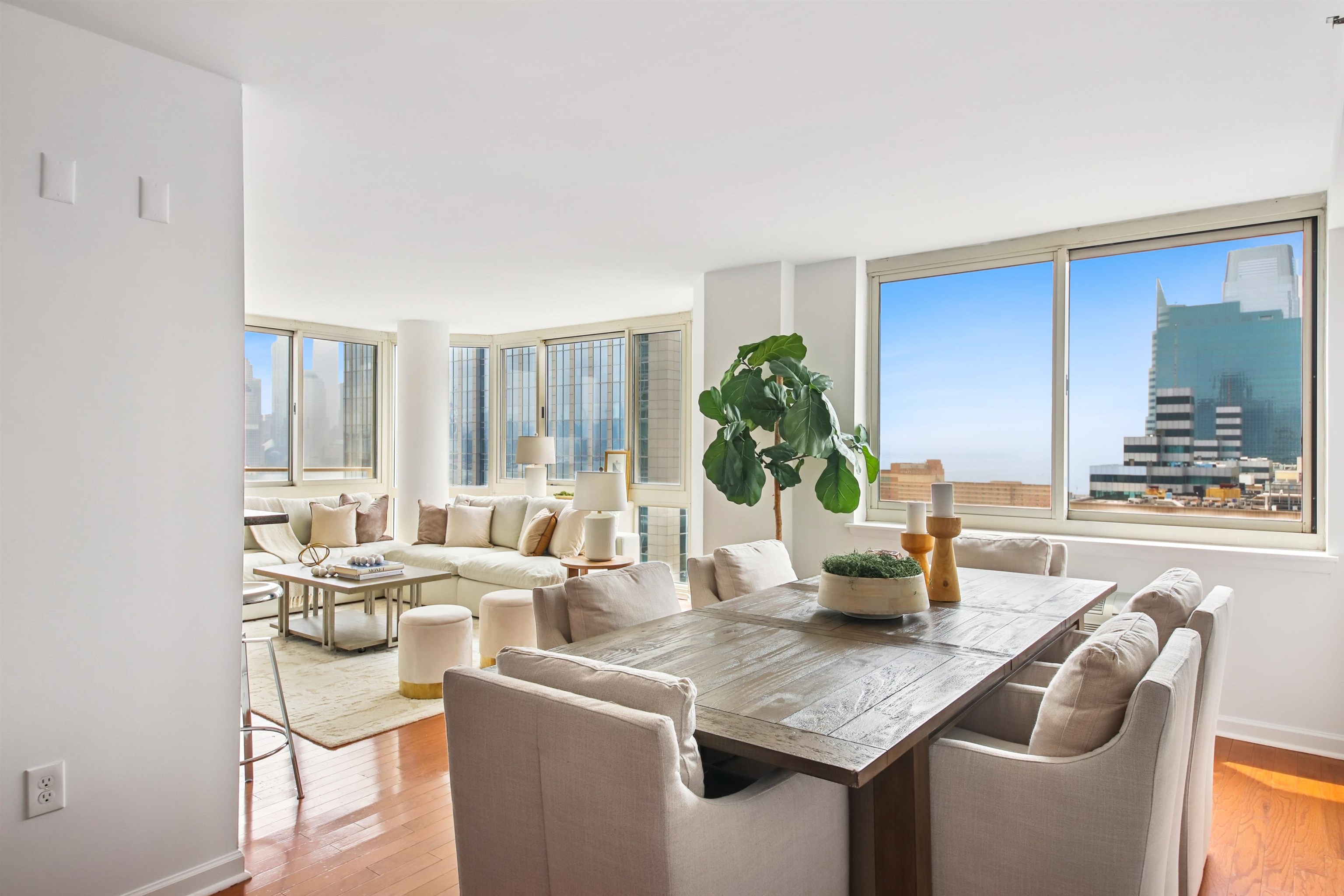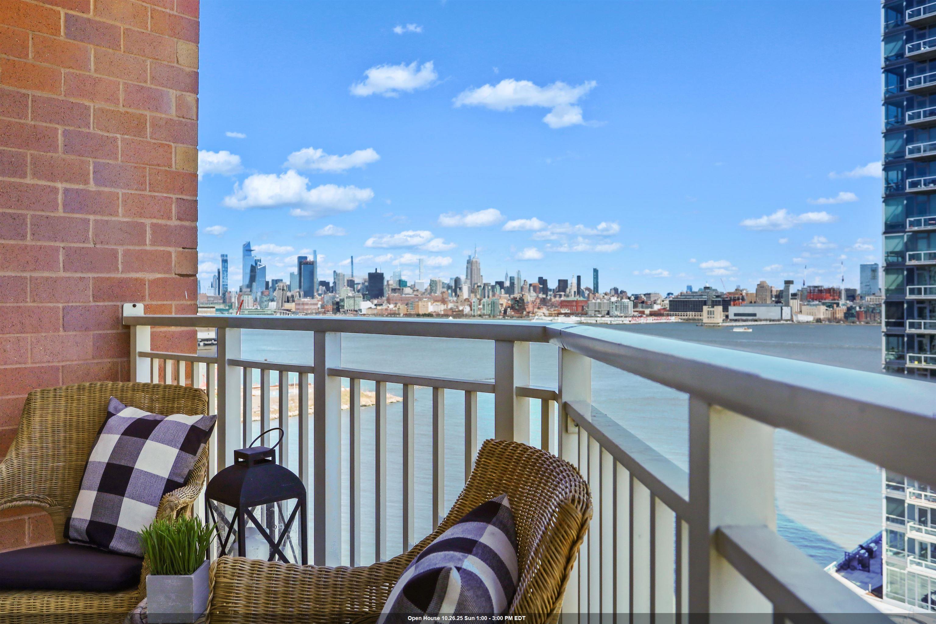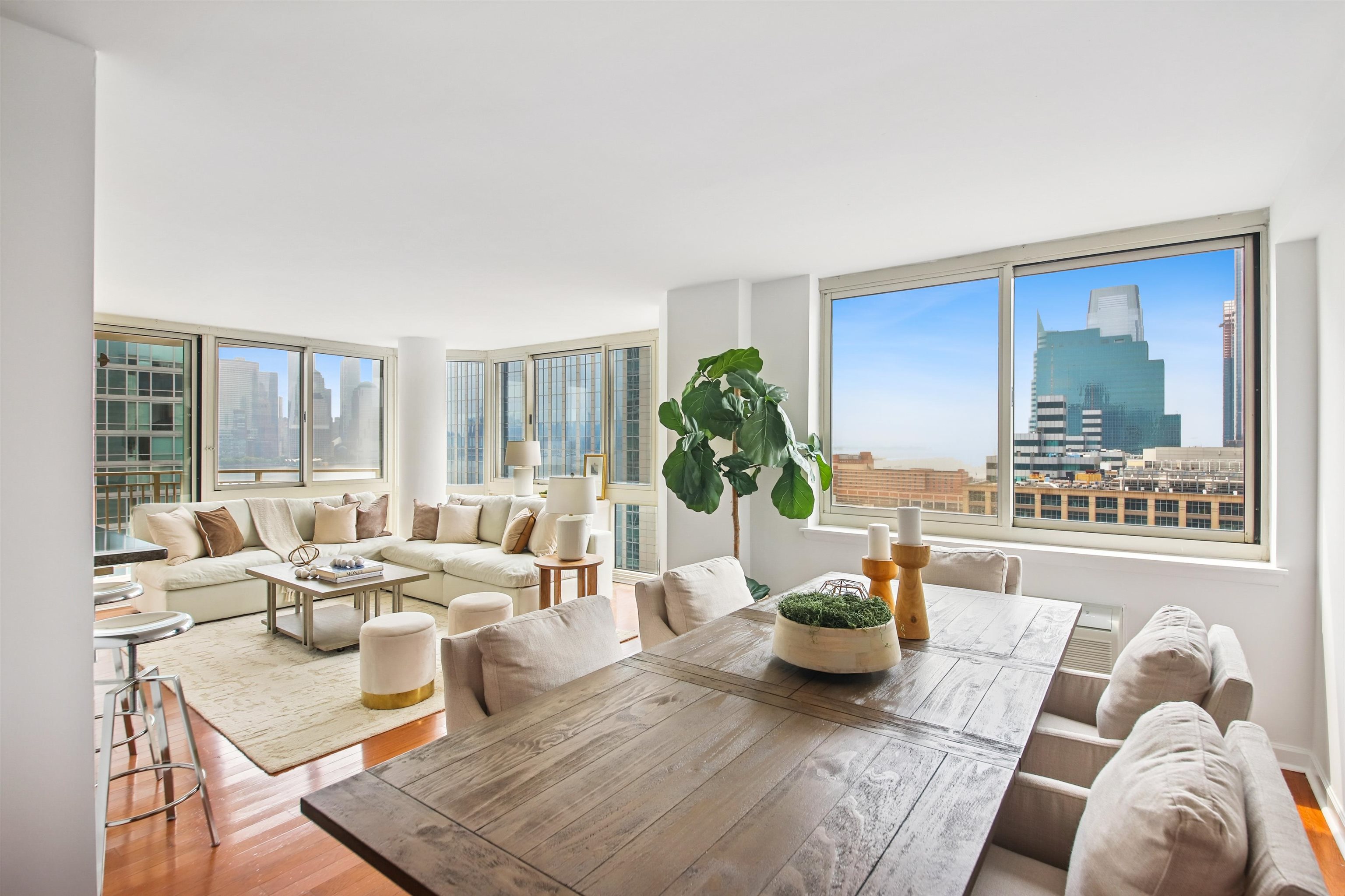 19TH FLOOR SOUTHEAST CORNER, with Unbelievable Views, Privacy, and Quiet! This spectacular, high floor, 3 BEDROOM, 2 bath, wrap corner residence on the EXCHANGE PLACE waterfront! Perched on the 19th floor with unbelievable, panoramic vistas, this trophy property is truly exceptional. Over 1,450 square feet of opulence featuring triple exposures (S/N/E), outlining some of the world's most beautiful landmarks. Wrapped entirely in glass, this light-filled home features gleaming hardwood floors, brilliant paint hues in Benjamin Moore whites, and decorator lighting. A private entry foyer opens onto the large living/dining area and an oversized balcony framing the Freedom Tower front and center! Indoor/outdoor living is all yours as these incredible views serve as your backdrop for al fresco dining, lounging, and entertaining. The chef's kitchen features a full suite of s/s appliances, high end countertops, and reflective tile backsplash finished in "steel". Wake up each morning looking directly at the Empire State Building in your primary ensuite bedroom, which is a king-sized sanctuary! Featuring a large, California-style walk-in closet, stone bath, and soaking tub. Two other generous bedrooms also frame spectacular views, and another full bath stone bath, is smartly placed on the other side of the home for both privacy and personal space. A full size in-home LG wash tower W/D, storage galore, and an INCLUDED garage parking space complete this waterfront dream. The full service Mandalay resides directly on the Exchange Place waterfront, and features 24 hr. concierge/security, package service, sparkling heated waterfront pool and outdoor terrace, gym, and on-site management office. Terrific shopping, dining, nightlife, waterfront promenade, 2 PATH stations, the NY Waterway, and multiple education options are right outside your front door! A spectacular lobby renovation is underway and slated to be completed shortly. A true family-sized property not to be missed!