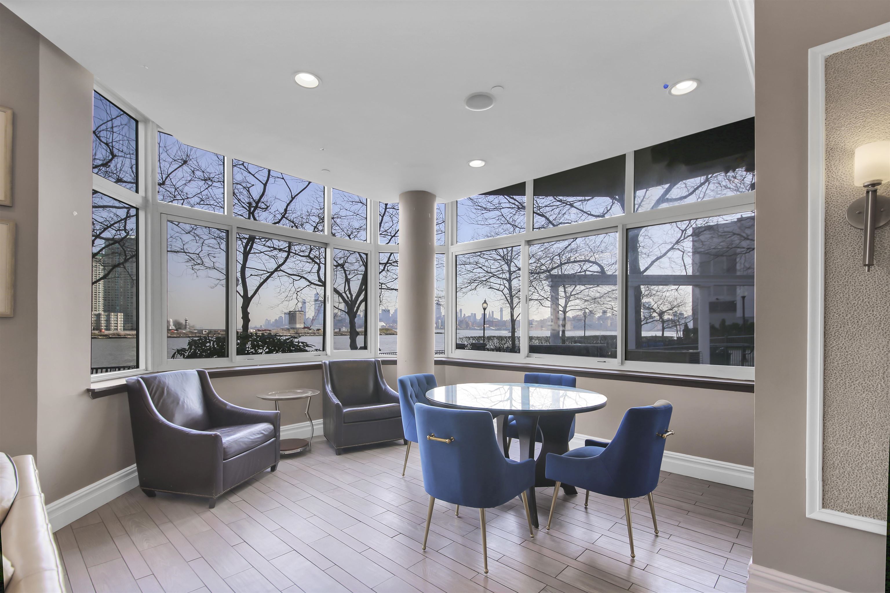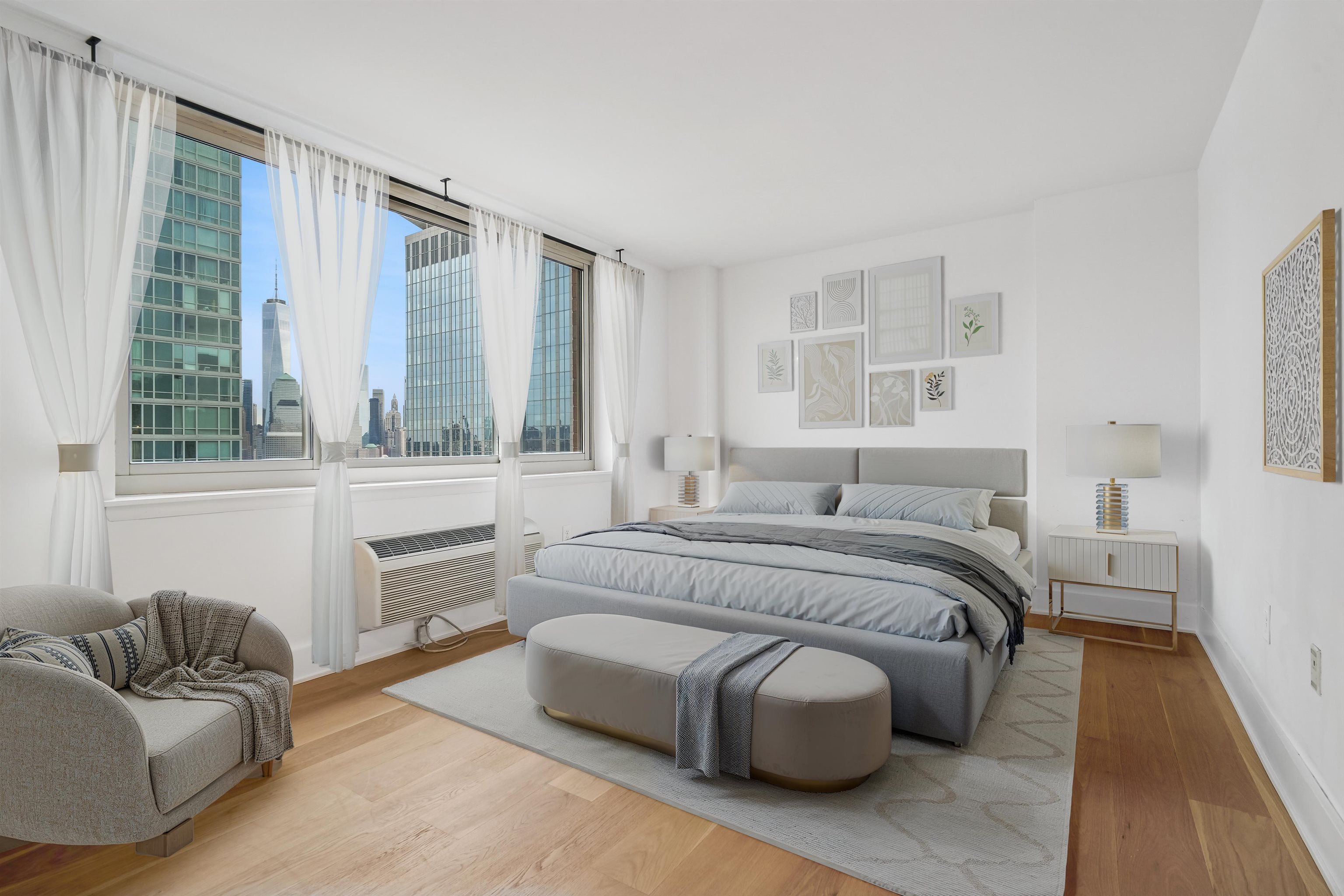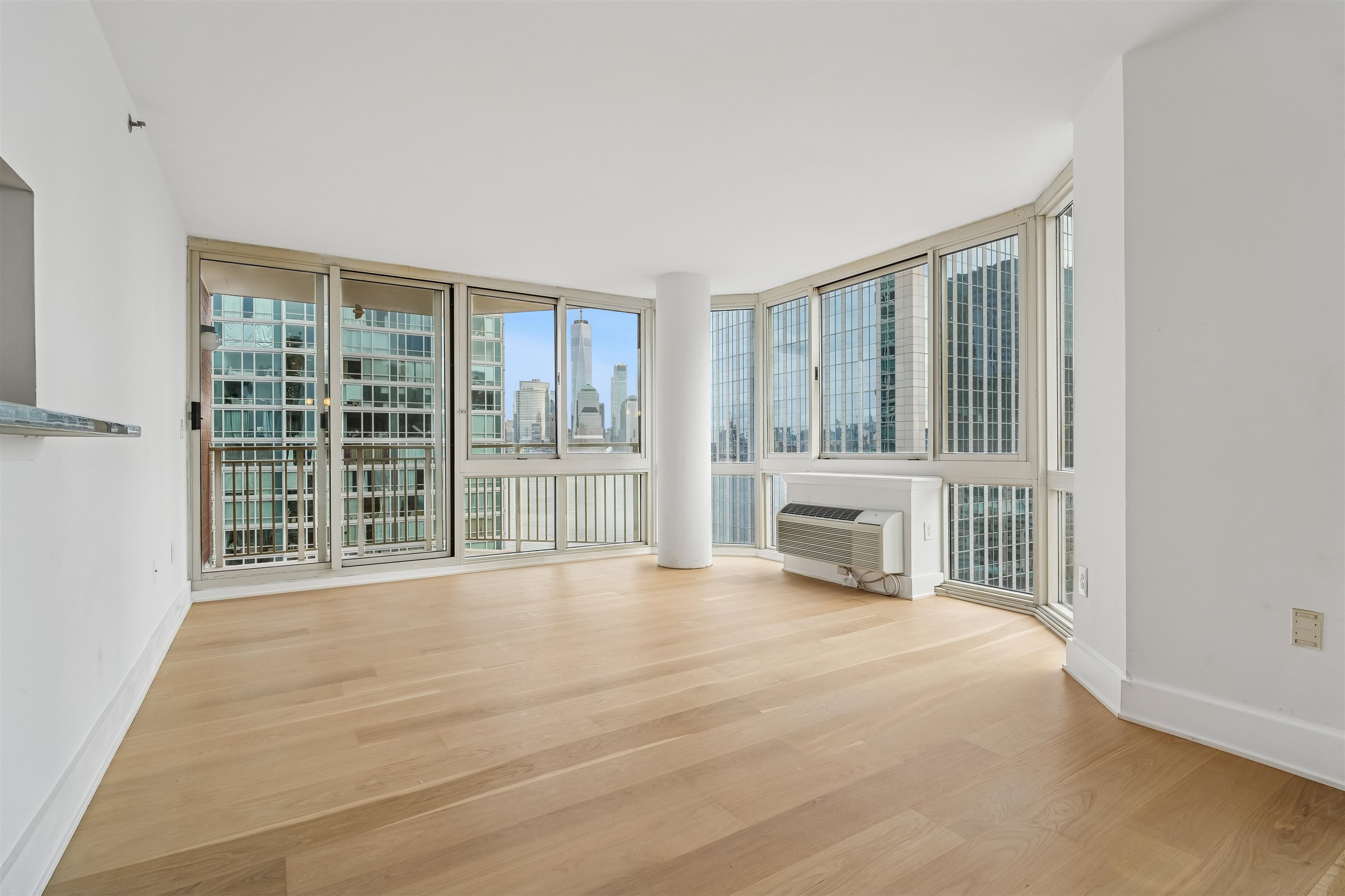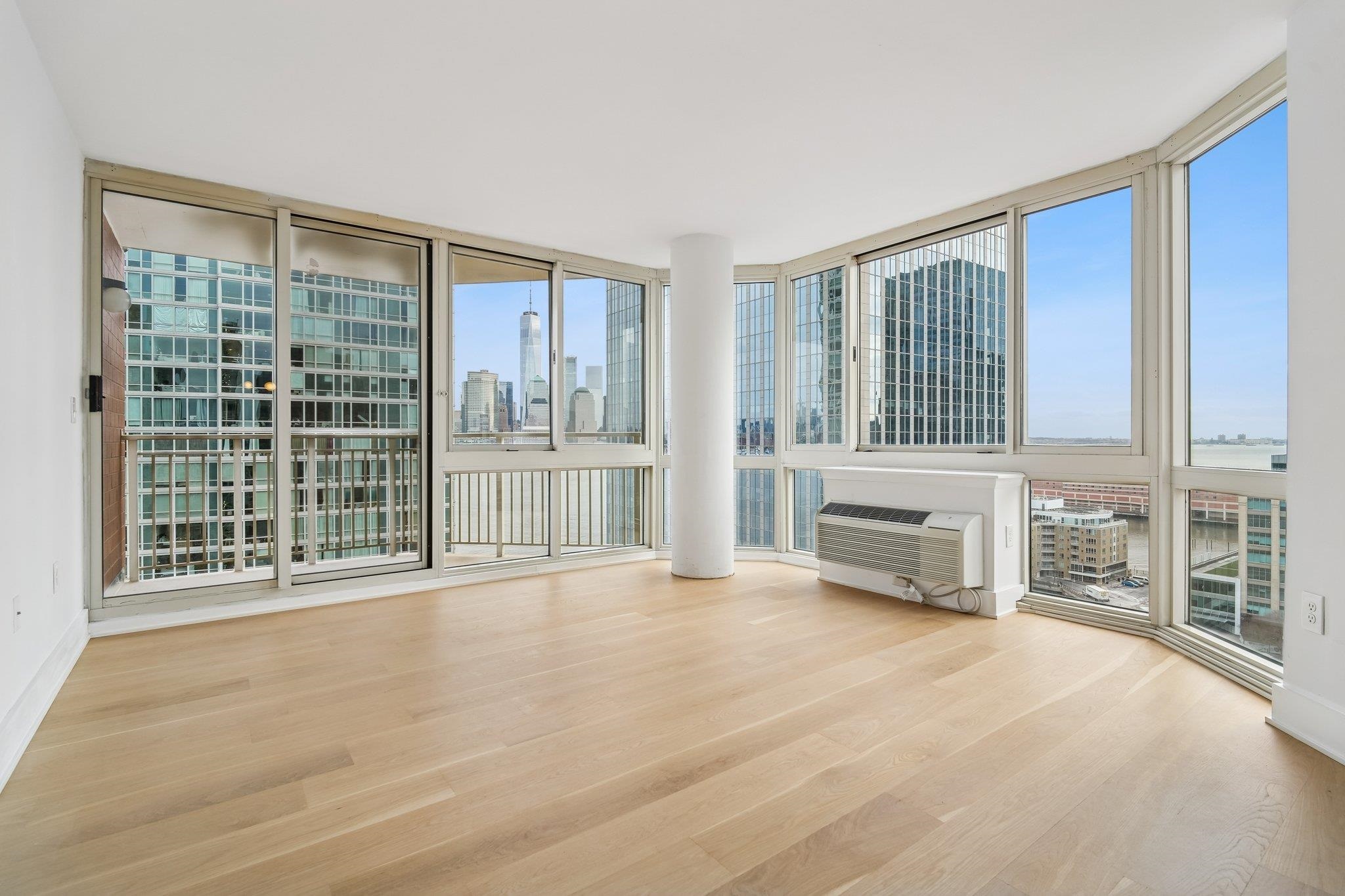 Live at the TOP! High floor, SE corner with unbelievable exposures directly on the Exchange Place Waterfront. This large 3-bedroom, 2 full bath home features a phenomenal floor plan and is engulfed in spectacular natural light. Brand new wide-plank, white oak flooring throughout, offset by square cut 6" baseboard moldings, gives this residence a refined, luxurious finish. An expansive corner living/dining room, takes full advantage of the direct Freedom Tower and Hudson River views, and opens directly onto your private terrace with more astounding views stretching from lower Manhattan all the way up to the GWB! Wake each day in your primary suite with the Empire State building and Hudson Yards front and center. This king-sized sanctuary also features three custom built-in closets, and spa-like ensuite bathroom. Two additionally large, bright, and view forward bedrooms, along with another beautiful full bath, are smartly placed on the other side of the home for privacy and livability. Your Chef's kitchen is complete with s/s appliances, abundant walnut cabinetry, stone countertops, and breakfast bar. Private entry foyer, in-home LG wash tower W/D, and an included on-site garage parking space complete the picture. The full service Mandalay features 24/7 doorman, gym, sparkling pool, community room, stunning new lobby (nearing completion), and children's play area. Located directly on the Waterfront, you're mere minutes from top dining, shopping, Whole Foods Market, Waterfront promenade, and the Newport/Grove/Exchange Place PATH stations, as well as the NY Waterway ferry. A remarkable Downtown opportunity.
