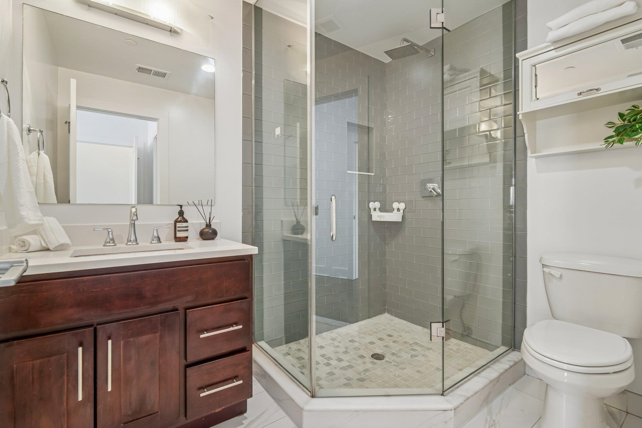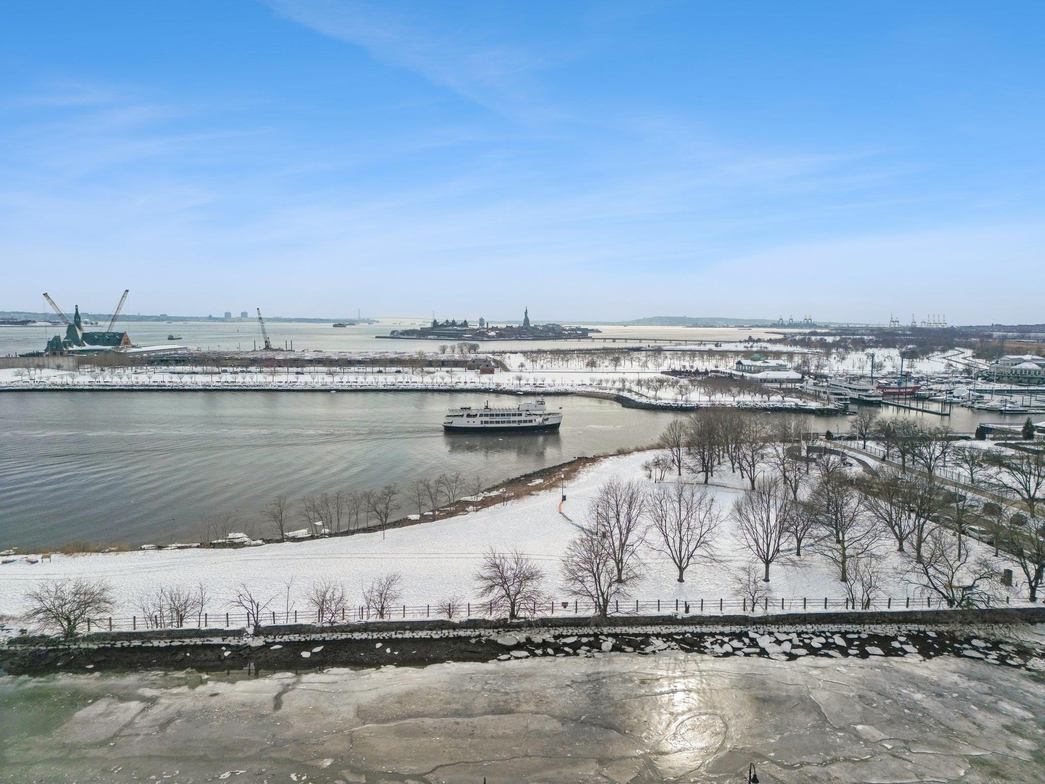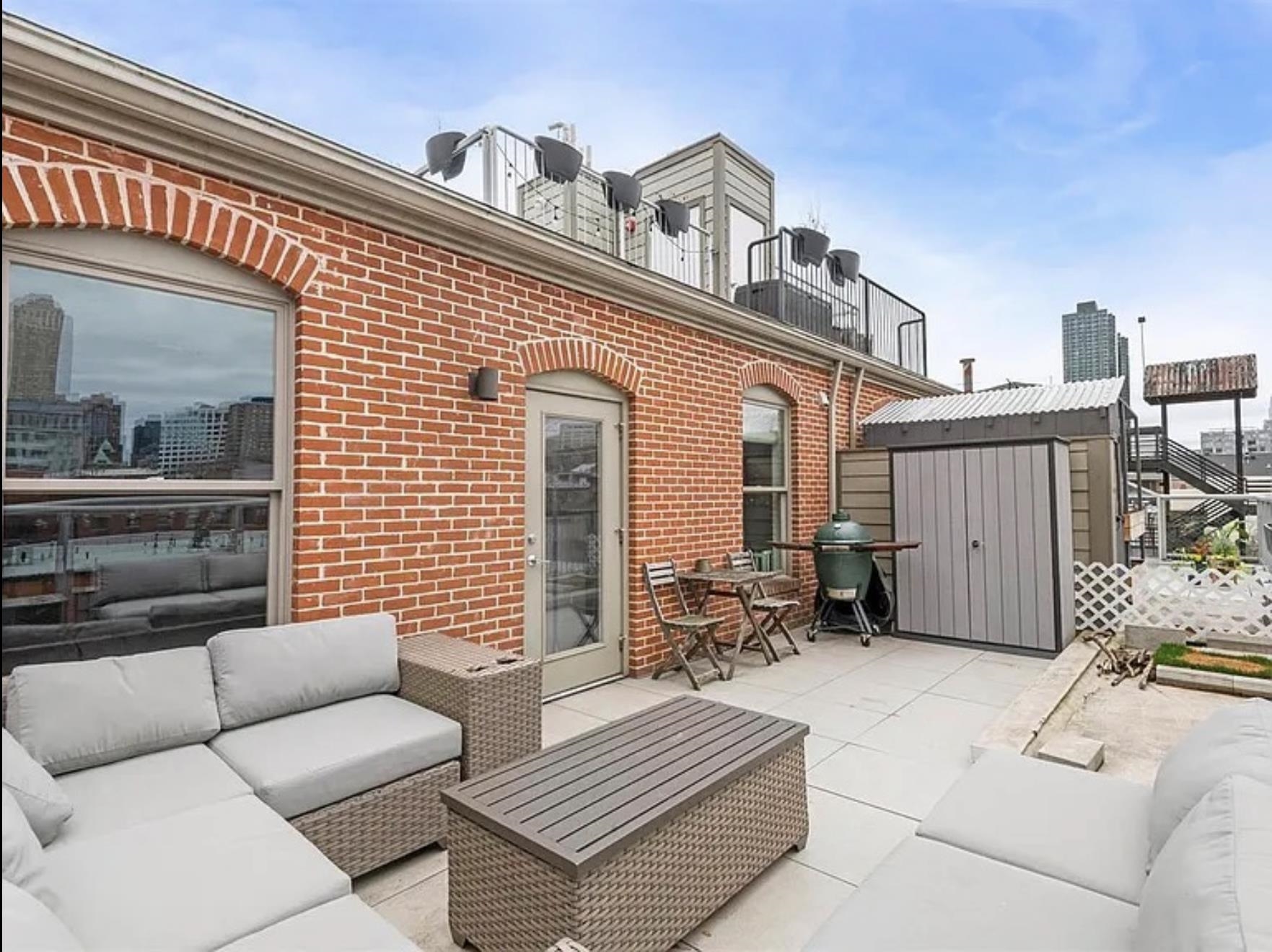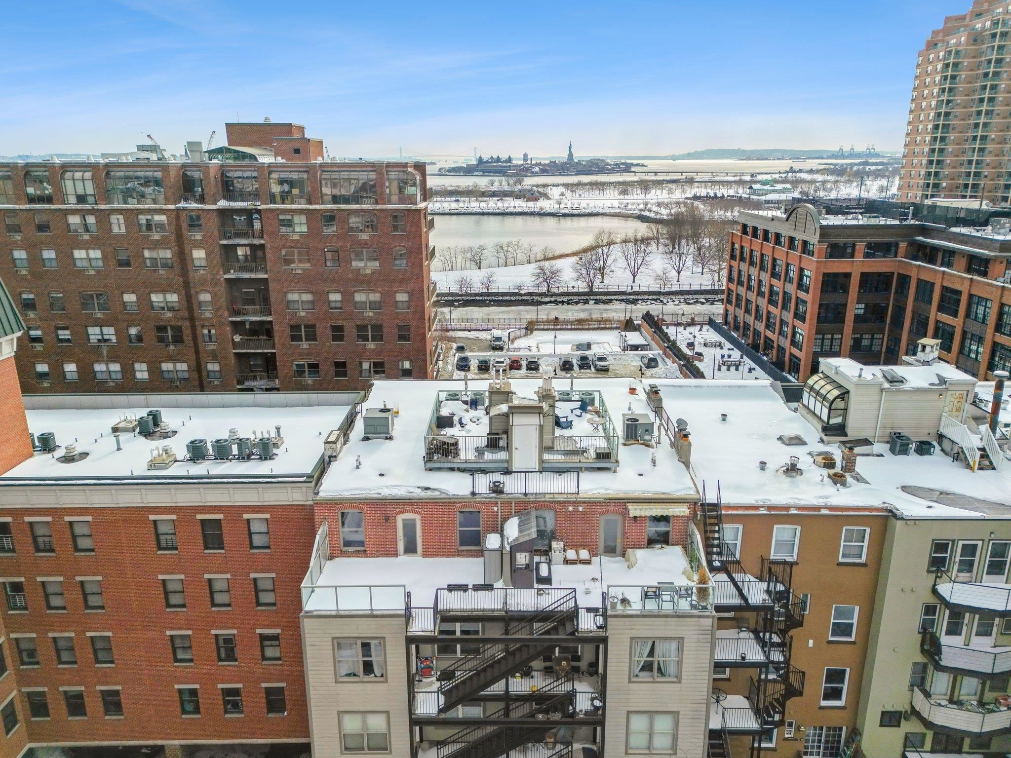 Penthouse Bliss with Private Terrace in PAULUS HOOK! On beautiful tree-lined Essex St, directly on the Hudson River, awaits this stunning 2 bed, 2 full bath beauty in a magnificent, modern, Brownstone! Residence 7 features sky-high ceilings, direct Statue of Liberty and Hudson River views, gleaming espresso hardwood floors, oversized windows, and a fabulous floor plan! Upon entering the home, your immediately greeted with abundant sunlight, open concept LR/DR, and amazing kitchen with a huge Chef's counter, full s/s appliance suite, marble backsplash, under counter lighting, and abundant lacquer cabinetry. The primary suite is a sanctuary unto itself, with king-sized proportions, custom California-style walk-in closet, and spa bath w/frameless glass shower. Direct access to your 340 sq. ft. private terrace high in the sky.......morning coffee, al-fresco dining, yoga poses, and entertaining awaits. An included storage shed for all your bulky items and gardening tools, too. Another beautiful bedroom and full bath await on the other side of the home. Luxury paints in hues of Benjamin Moore whites, full size in-home W/D, Central HVAC, extensive LED recessed lighting, and virtual intercom complete the picture. One of the finest addresses in Jersey City, located in close proximity to 2 PATH stations, the NY Waterway, and Hudson River promenade for the dream commute and transportation options. Private"Essex St residents only" parking is a breeze. The vibrant Paulus Hook neighborhood features top dining, cafes, shopping, Whole Foods market, and the notable PS16/Bradford school district for an unmatched lifestyle. A rare opportunity awaits!